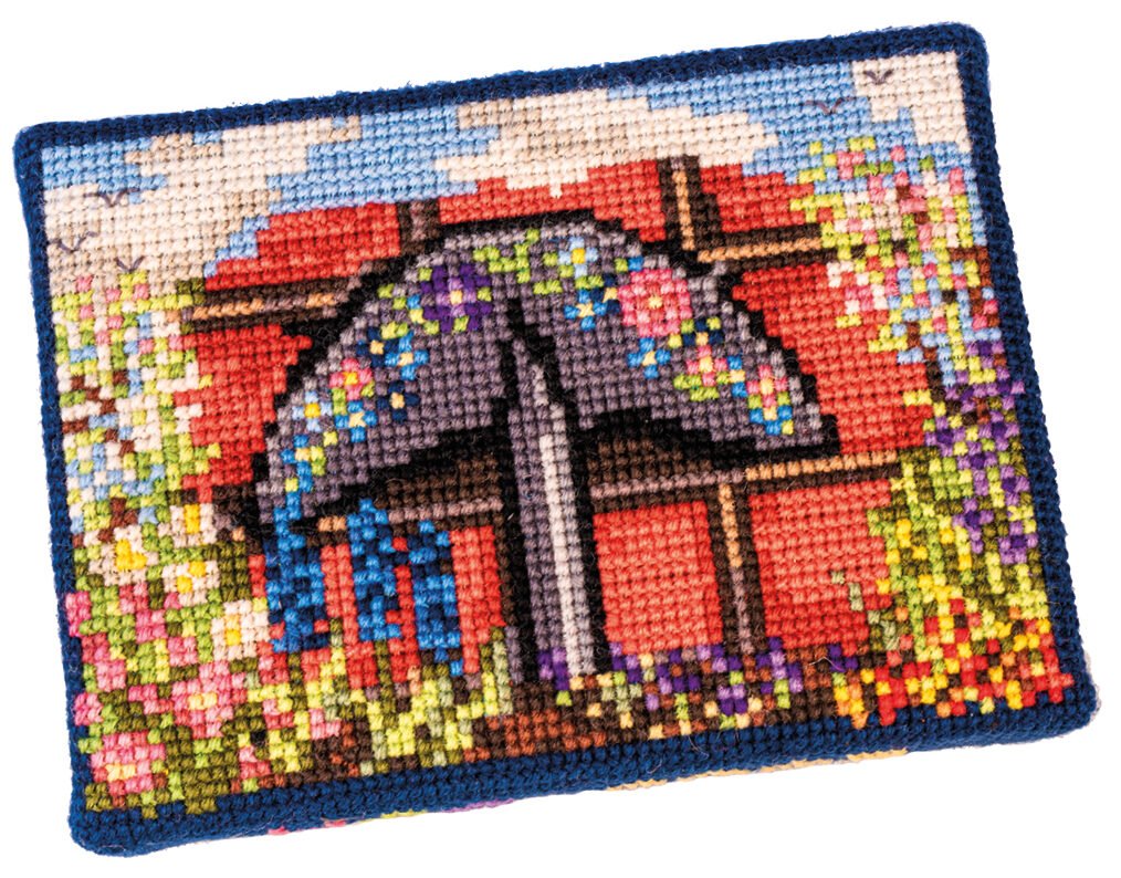 This design is the Wanstead Community Gardeners’ logo of an edging tool against a brick wall, adapted for cross-stitch. Rosemary Thomas OBE said: “The kneeler project is appropriate for us since we spend so much time on our knees! We are street gardeners and our aim is to adopt sad patches of public soil (SPPSs) and make them worth walking past. Our first SPPS was the Corner House garden, started in April 2003. Wanstead’s iconic and much-loved High Street cottage garden was, at that time, indeed a very sad patch. Since then, we have adopted tree surrounds, pavement beds, a traffic roundabout and some interesting patches in very unexpected places. No sad patch of earth seen from the street is safe. Our volunteers are our lifeblood. Interested people join in with the work parties and give what time they can, some adopting their own area. For all of us, it is a way of taking some ownership of our environment. Over forty patches have been adopted so far. Long may we continue!”